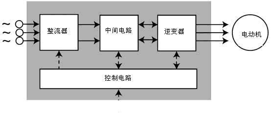 變頻器是把工頻電源(50Hz或60Hz)變換成各種頻率的交流電源,以實(shí)現(xiàn)電機(jī)的變速運(yùn)行的設(shè)備。如圖1所示,其中控制電路完成對主電路的控制,整流電路將交流電變換成直流電,直流中間電路對整流電路的輸出進(jìn)行平滑濾波,逆變電路將直流電再逆變成交流電。對于如矢量控制變頻器這種需要大量運(yùn)算的變頻器來說,有時(shí)還需要一個(gè)進(jìn)行轉(zhuǎn)矩計(jì)算的CPU以及一些相應(yīng)的電路。