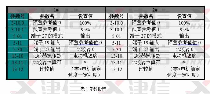 1、1#機(jī)先開(kāi)機(jī)以100%速度運(yùn)行,端子27接至2#機(jī)的端子19,易知此時(shí)端子27輸出高電平至2#機(jī)的端子19,2#機(jī)開(kāi)機(jī)則選擇預(yù)置參考值1,以95%速度運(yùn)行;