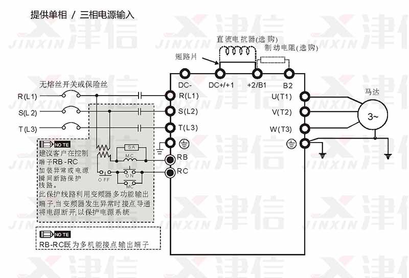 變頻器的主回路電源端子 R/L1、S/L2、T/L3 是輸入電源端。如果將電源錯 誤連接于真E端子,則將損壞變頻器。另外應(yīng)確認(rèn)電源應(yīng)在銘牌標(biāo)示的允許