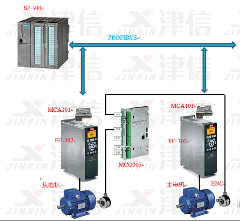 PLC與丹佛斯FC302變頻器之間進(jìn)行PROFIBUS通訊,通過PLC可以設(shè)置同步功能、非同步功能、等工藝參數(shù);FC302變頻器控制從機(jī)電機(jī),以保證出標(biāo)精度及響應(yīng)精度。 變頻器通過MCO305運(yùn)動(dòng)控制卡,實(shí)現(xiàn)角度同步控制。MCO305運(yùn)動(dòng)控制卡內(nèi)要編程,接收現(xiàn)場總線控制命令,發(fā)送各種狀態(tài)信號(hào),實(shí)現(xiàn)各種控制,如單機(jī)運(yùn)行/同步運(yùn)行模式切換,判斷從機(jī)編碼器故障等。