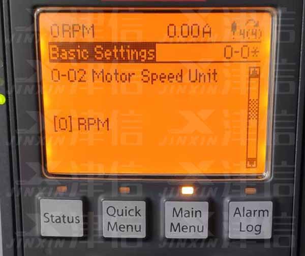 選擇0-02,選擇電機(jī)速度單位,默認(rèn)為選項[0]:RPM,[1]為Hz