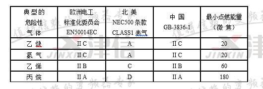 注:中國(guó)GB3836標(biāo)準(zhǔn)規(guī)定ⅡC級(jí)最小點(diǎn)燃能量為19微焦耳,ⅡA級(jí)最小點(diǎn)燃能量為200微焦耳。