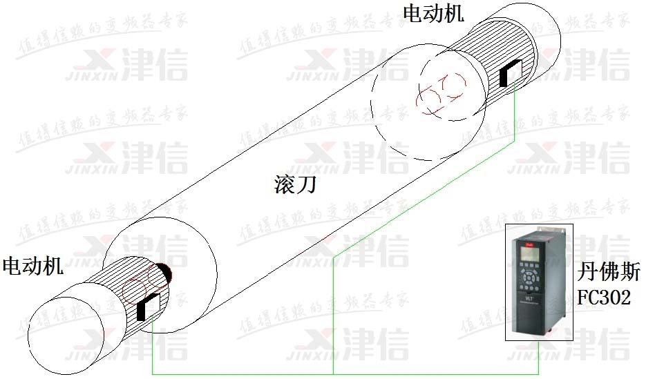 丹佛斯FC302變頻器通過磁通矢量控制同時驅(qū)動兩臺異步伺服電機(jī),保證在飛剪同步的過程中滾刀兩電機(jī)輸出轉(zhuǎn)速和轉(zhuǎn)矩一致。在選型和調(diào)試時只要將電機(jī)的功率和電機(jī)的電流相加即可,這樣就可以只通過丹佛斯FC302變頻器來實(shí)現(xiàn)剛性連接的兩個電機(jī)同步。
