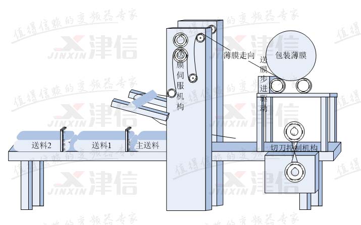 送膜控制有定長送膜和色標(biāo)對標(biāo)送膜兩種情況。定長送膜,只需根據(jù)主軸編碼器信號,主軸轉(zhuǎn)一圈(輸送一個物料),送膜部分輸送一段固定長度的膜即可,不需動態(tài)調(diào)整;色標(biāo)對標(biāo)送膜,不但要求主軸轉(zhuǎn)一圈輸送一段固定長度的膜,還要求膜上的色標(biāo)點(diǎn)正好落在主軸的設(shè)定相位點(diǎn)上,以使橫切刀能精確地切在色標(biāo)點(diǎn)上。因此色標(biāo)對標(biāo)送膜還需要根據(jù)檢測到的實(shí)際色標(biāo)相位差,在生產(chǎn)過程中動態(tài)調(diào)整送膜電機(jī)的相位。