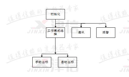 開(kāi)機(jī)后,首先進(jìn)行程序的初始化。初始化完成后同時(shí)調(diào)用工作模式選擇、報(bào)警和PLC與變頻器之間的通訊程序。工作模式中,包含手動(dòng)出標(biāo)、自動(dòng)出標(biāo)兩種狀態(tài)。報(bào)警程序用于對(duì)機(jī)器狀態(tài)進(jìn)行實(shí)時(shí)監(jiān)控,并根據(jù)故障情況執(zhí)行相關(guān)動(dòng)作。