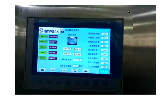 如圖中所示;設(shè)備采用了真空旋轉(zhuǎn)式標(biāo)盤(pán),具有吸標(biāo)、傳輸、貼標(biāo)等多方面功能,同時(shí)涂膠輥與切刀輥負(fù)責(zé)標(biāo)簽的切斷與涂膠,并設(shè)有‘無(wú)瓶不出標(biāo)’和‘無(wú)標(biāo)不涂膠’功能,提高了貼標(biāo)效率與工作的可靠性。