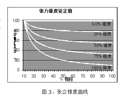 收卷張力錐度控制:有了當(dāng)前卷徑值,和張力錐度設(shè)定值,就能計(jì)算當(dāng)前張力。張力與卷徑的關(guān)系如圖3所示,當(dāng)張力錐度為0時(shí),張力保持恒定不變,相當(dāng)于恒張力控制;當(dāng)張力錐度為100%時(shí),卷徑每增大1倍,張力就下降一半,相當(dāng)于恒轉(zhuǎn)矩控制。計(jì)算公式如下: