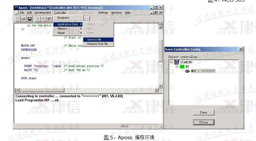 丹佛斯運(yùn)動(dòng)控制器使用丹佛斯公司開(kāi)發(fā)的Aposs運(yùn)動(dòng)控制語(yǔ)言,其編程風(fēng)格模仿C語(yǔ)言,并提供多種便利的宏指令,其界面如下圖5所示: