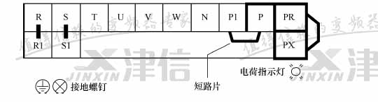 其中端子排上的R、S、T 端子與三相工頻電源連接, U、V、W 端子與電動機(jī)連接; P1、P 端子, PR、PX 端子, R、R1 端子和S、S1 端子用短接片連接; 接地端子用螺釘與接地線連接固定。