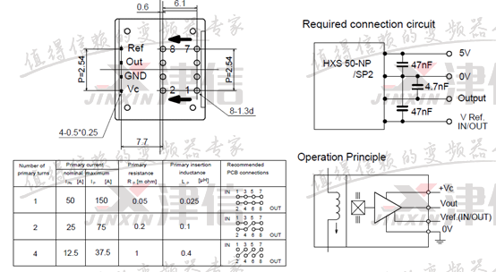3、測(cè)量三相輸出電流檢測(cè)電路,查看電流傳感器型號(hào)為HXS 50-NP,測(cè)量輸入電源只有2.4V,而HXS 50-NP正常工作的輸入電源為5V??梢源_定故障點(diǎn)在此。接線圖如下: