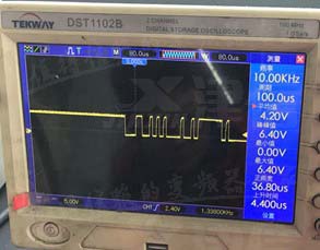 給變頻器送電后,變頻器面板顯示ERR37,根據(jù)故障解釋說明,檢查CPU小板反饋至控制卡的信號(hào)波形異常,有帶毛刺的尖雜波。測(cè)量點(diǎn)為下圖45,47號(hào)。