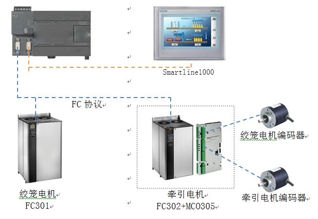 PLC的PORT1口與兩臺變頻器在一個總線上,采用FC協(xié)議進行通信;PORT0則連接西門子的人機屏。其中牽引電機變頻器FC302上,安裝MCO305選件卡,同時將兩個電機的編碼器都接到MCO305上。由絞籠電機作為主軸,牽引電機作為從軸與主軸同步運動。