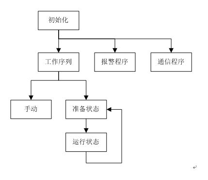 開機后,首先進行通信和狀態(tài)的初始化。初始化完成后同時調(diào)用工作序列、報警和通信子程序。工作序列中,包含手動和自動兩種狀態(tài),自動運行又包括機組準備(包括:松開機械抱閘、關(guān)閉防護門等動作)和機器運行兩個狀態(tài)。報警程序用于對機器狀態(tài)進行實時監(jiān)控,并根據(jù)故障情況執(zhí)行相關(guān)動作。通信程序用于PLC和變頻器的FC協(xié)議通信。
