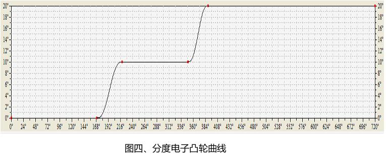 設備通過分度伺服跟隨主軸執(zhí)行預先設定的電子凸輪數(shù)據(jù),從而達到對定子的分度控制。分度電子凸輪曲線如圖四所示。