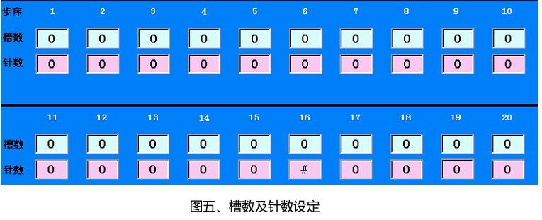 用戶可以通過HMI一鍵生成“逐槽綁”數(shù)據(jù),也可以自行設定綁扎槽位順序,自定義每一槽針數(shù),還可以設定定子分度方向,從而實現(xiàn)逐槽綁、花式綁、正綁、反綁。設定界面如圖五所示。