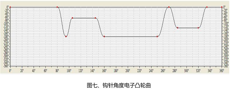 10MC總線運動控制器控制主軸運行,主軸帶動機械凸輪控制鉤針的前后運動,同時主軸又作為鉤針、上下電子凸輪的主軸信號,控制鉤針伺服、上下凸輪伺服根據(jù)預設的凸輪數(shù)據(jù)運動。