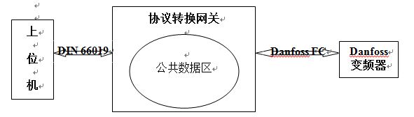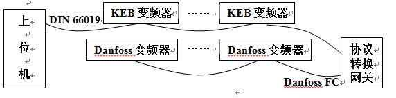 為了節(jié)省投資,變頻器替換采取逐步進(jìn)行方式,即損壞一臺(tái)KEB變頻器,替換一臺(tái)。也就是說系統(tǒng)中將同時(shí)存在兩種變頻器和兩種協(xié)議?,F(xiàn)在要開發(fā)的通訊協(xié)議轉(zhuǎn)換網(wǎng)關(guān)就是要使其對(duì)上位機(jī)而言,丹佛斯依然被視作DIN 66019協(xié)議的數(shù)據(jù)設(shè)備;而對(duì)于Danfoss變頻器而言,還是在Danfoss FC協(xié)議控制下工作。此外,根據(jù)功能需求分析,該協(xié)議轉(zhuǎn)換網(wǎng)關(guān)需要具有伸縮性,即增加Danfoss變頻器時(shí),需要將新增加的Danfoss變頻器包裝成DIN 66019協(xié)議下的設(shè)備,而不管丹佛斯變頻器的數(shù)量多少,在上位機(jī)看來,它們應(yīng)該是DIN 66019協(xié)議下的與原KEB變頻器沒有任何沖突的設(shè)備。兩種協(xié)議并存的結(jié)構(gòu)框圖如圖2所示。