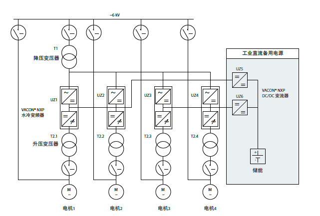 通過采用低壓水冷變頻器并結(jié)合“降壓-升壓”方案,來驅(qū)動(dòng)中壓電機(jī),IC-ART 和丹佛斯共同開發(fā)的直流備用電源系統(tǒng)來保證主電晃電或故障時(shí)的可靠持續(xù)運(yùn)行。