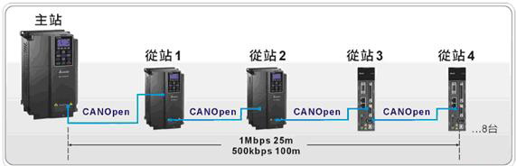 以往的變頻器是扮演純粹驅(qū)動的角色,接收上位機的命令做各種機械運動,C2000內(nèi)建的PLC功能,同時支援CANopen通訊機能,當客戶有做兩臺以上變頻器的應用時,只需要透過一臺C2000做主站,就可以實現(xiàn)最多同時/控制8臺C2000或ASDA-A2伺服的應用,還可以利用分散式I/O的方式來控制遠程I/O節(jié)點,增加主機 I/O。