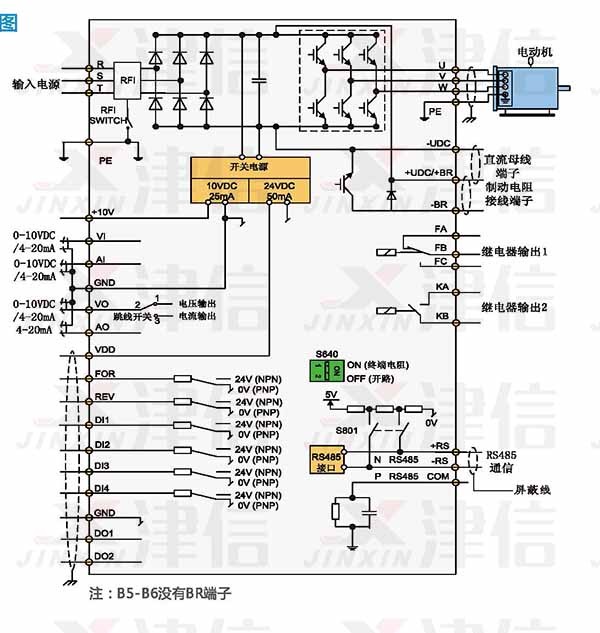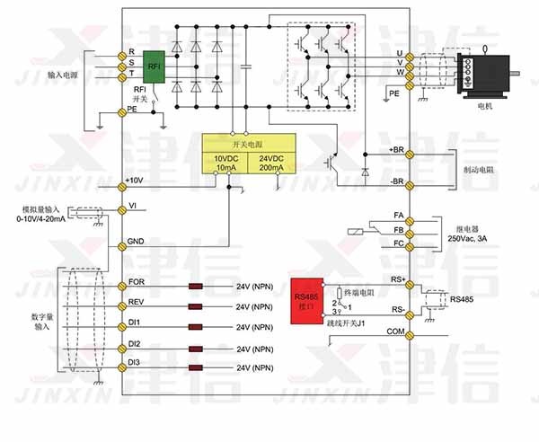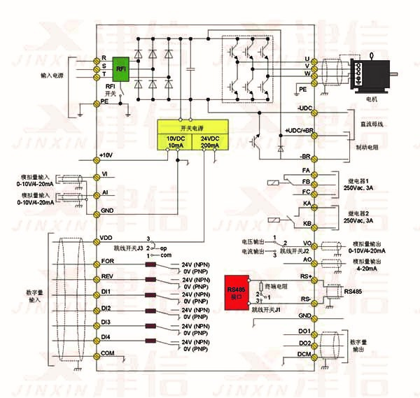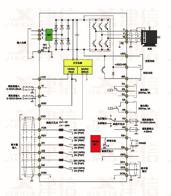 海利普變頻器主要由整流、濾波、逆變、驅動單元、制動單元、檢測單元微處理單元等組成。采用交-直-交工作原理,首先將三相交流電經(jīng)整流模塊變換成直流,再進行濾波后,通過IGBT等其它電力電子器件逆變成頻率和電壓均可變的三相交流電供電機使用。同時,通過IGBT的開斷調整輸出電源的頻率和電壓,從而達到調速、節(jié)能的作用。以下是海利普各系列變頻器的接線示意圖。