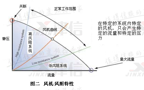 選擇風機的基本原則:在特定的系統(tǒng)里特定的風機,只會產生特定的流量和特定的壓力。風機輸出壓力特性曲線和系統(tǒng)風阻特性曲線的交點就是風機的工作點。