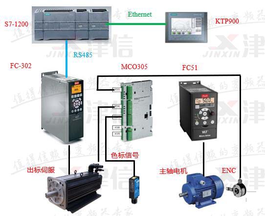 PLC與觸摸屏之間進(jìn)行Ethernet通訊,PLC與丹佛斯FC302變頻器之間進(jìn)行RS485通信,通過(guò)觸摸屏可以設(shè)置標(biāo)長(zhǎng)、對(duì)標(biāo)位置、出標(biāo)起始位置等工藝參數(shù);FC302變頻器控制出標(biāo)伺服電機(jī),以保證出標(biāo)精度及響應(yīng)精度。