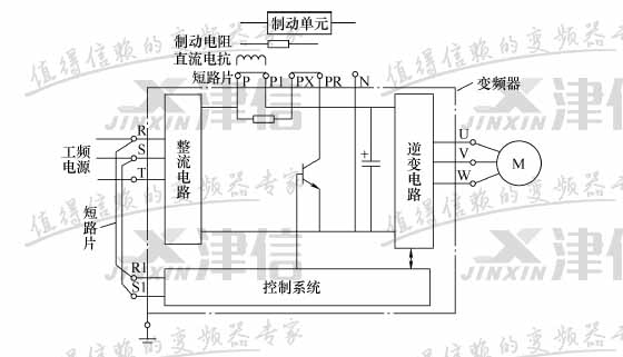 2、PX、PR 端子外接短路片, 將內(nèi)部制動電阻和制動控制器件連接起來。有時,變頻器在高頻度制動內(nèi)置制動電阻時易發(fā)熱, 由于封閉散熱能力不足, 這時需要安裝外接制動電阻來替代內(nèi)置制動電阻。 可將PX、PR 端子之間的短路片取下, 再在P、PR 端外接制動電阻。