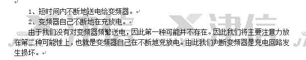 更換變頻器充電卡,依次安裝好變頻器的電源卡,控制卡,操作面板及上蓋板等。檢查變頻器的二極管特性及對地絕緣,符合送電的標準。將變頻器送電,自檢通過后,測量輸入側電源電壓,輸入變頻器參數(shù),開機輸出電壓平衡。帶負載測量輸入和輸出電流平衡,變頻器修復。