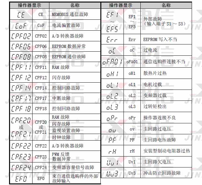 1、故障報警代碼CE,COF,ERR,CPF02,CPF06,CPF08,CPF11,CPF12,CPF14,CPF18,CPF20,CPF21,CPF22,CPF23,CPF24,EF0,EF,OC,OFA01,OH1,OL,UV1,UV3