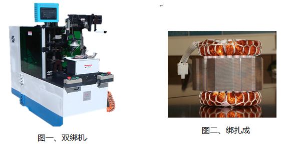 雙綁機用于綁扎電機定子線圈,主要動作有定子鐵芯分度,針桿進退、上下和角度控制,自動剪切線等,設有綁線張力調節(jié)器,可調節(jié)綁線的松緊。整機如圖一所示,綁扎效果如圖二。