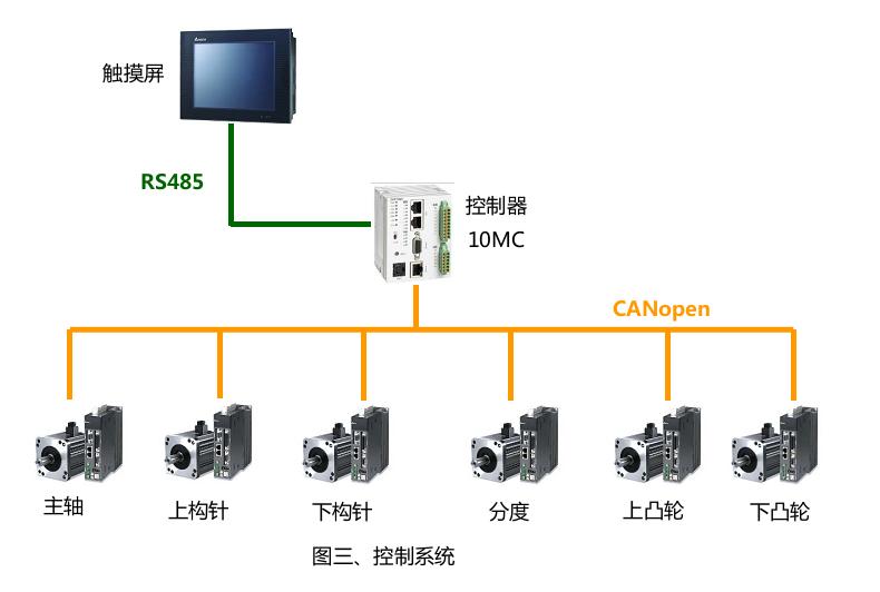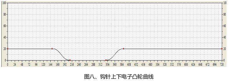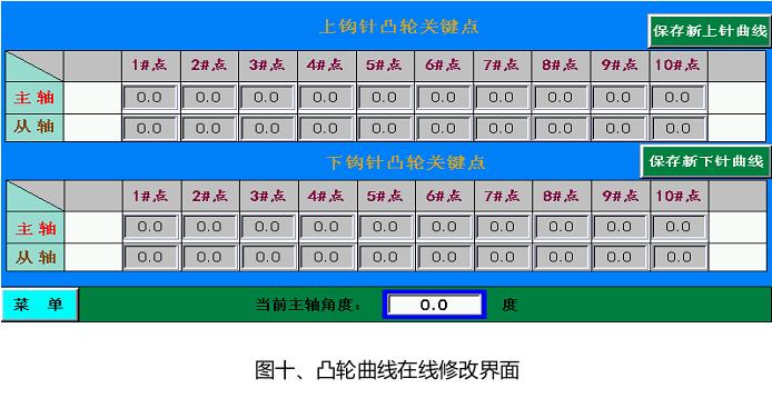 10MC總線運動控制器控制主軸運行,主軸帶動機械凸輪控制鉤針的前后運動,同時主軸又作為鉤針、上下電子凸輪的主軸信號,控制鉤針伺服、上下凸輪伺服根據(jù)預設的凸輪數(shù)據(jù)運動。