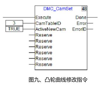 在實際使用中,因客戶產(chǎn)品的多樣性,不同的馬達定子,客戶需要隨時修改電子凸輪曲線,通過10MC運動控制器的“DMC_CamSet”指令可以在線實時修改電子凸輪曲線,提高了設備的通用性。凸輪曲線修改指令如圖九所示,在線修改凸輪曲線界面如圖十所示。
