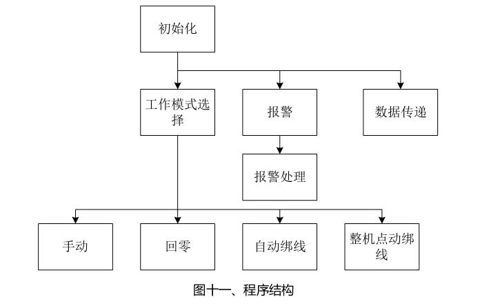 初始化程序負責在控制器送電開機后,對運動控制器的通訊端口、I/0端口以及程序進行初始化操作;然后起動后臺報警程序,用于監(jiān)控機器的故障狀態(tài),當設備發(fā)故障后,根據(jù)故障的等級,令設備執(zhí)行急停、暫停、警告等相對應的處理;然后進入回零模式,找到各軸的零位,并令各軸進入工作起始位置;只有等回零模式完成以后,設備才能進入自動工作模式;最后程序根據(jù)客戶選擇的工作模式,在得到起動命令以后,正式開始運行。一臺定子綁扎完畢以后,定子被自動送出,這時程序回到前面狀態(tài),等待新的起點命令。如此周而復始。