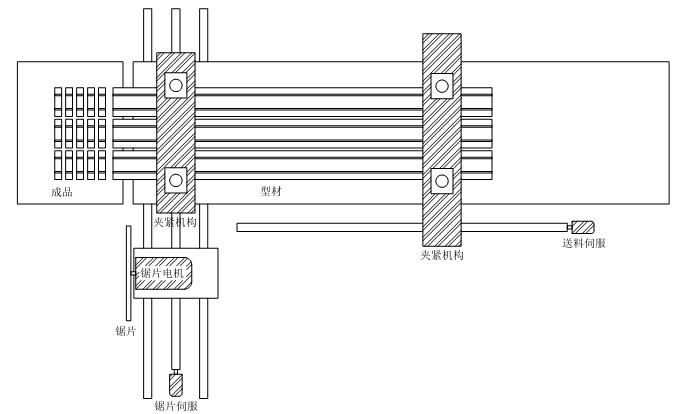 1.夾緊機(jī)構(gòu):機(jī)械中包含兩個(gè)夾緊機(jī)構(gòu)用于夾緊型材,一個(gè)負(fù)責(zé)在鋸切的時(shí)候防止型材移位,另一個(gè)由送料伺服帶動(dòng),用于帶動(dòng)型材完成型材進(jìn)給。