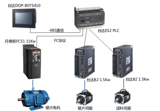 臺(tái)達(dá)ES2 PLC自帶兩組高速脈沖用于控制伺服,最高頻率到達(dá)100KHz,同時(shí)滿足了精度和速度的要求。ES2 PLC帶有兩組RS485通信口,分別與DOP-B07S410觸摸屏和FC51變頻器通信。