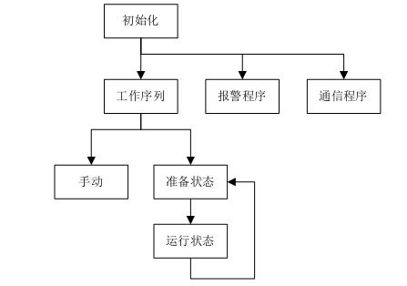 開(kāi)機(jī)后,首先進(jìn)行通信和狀態(tài)的初始化。初始化完成后同時(shí)調(diào)用工作序列、報(bào)警和通信子程序。工作序列中,包含手動(dòng)和自動(dòng)兩種狀態(tài),自動(dòng)運(yùn)行又包括單次鋸切和連續(xù)鋸切兩種工作模式。報(bào)警程序用于對(duì)機(jī)器狀態(tài)進(jìn)行實(shí)時(shí)監(jiān)控,并根據(jù)故障情況執(zhí)行相關(guān)動(dòng)作。通信程序用于PLC和變頻器的FC協(xié)議通信,實(shí)現(xiàn)運(yùn)行狀態(tài)和報(bào)警信息的監(jiān)控。