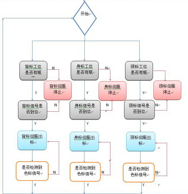 啤酒貼標(biāo)機(jī)由進(jìn)瓶傳送帶、主軸、出瓶傳送帶、貼標(biāo)伺服及各個位置傳感器組成。當(dāng)設(shè)備運(yùn)行時,系統(tǒng)會檢測當(dāng)前貼標(biāo)工位是否有瓶子,如有,則對應(yīng)得貼標(biāo)伺服開始動作。例如當(dāng)系統(tǒng)檢測到背標(biāo)工位上有瓶子,且貼標(biāo)有貼標(biāo)信號時,則貼標(biāo)伺服開始動作,由色標(biāo)檢測傳感器來結(jié)束貼標(biāo)動作,身標(biāo)與頸標(biāo)動作與背標(biāo)一致。