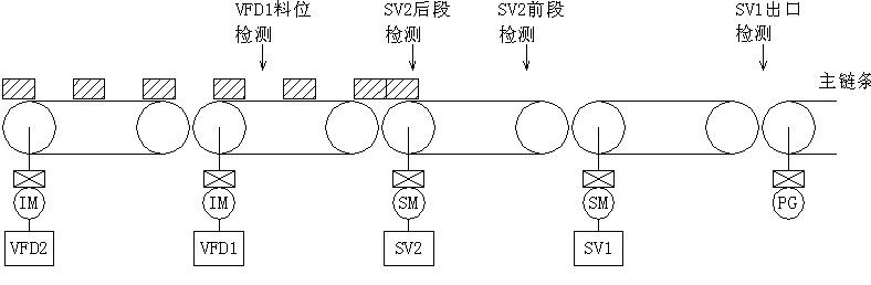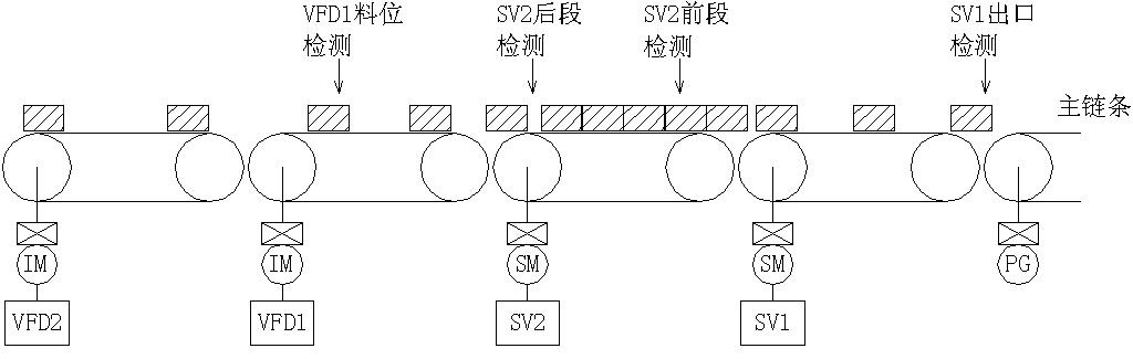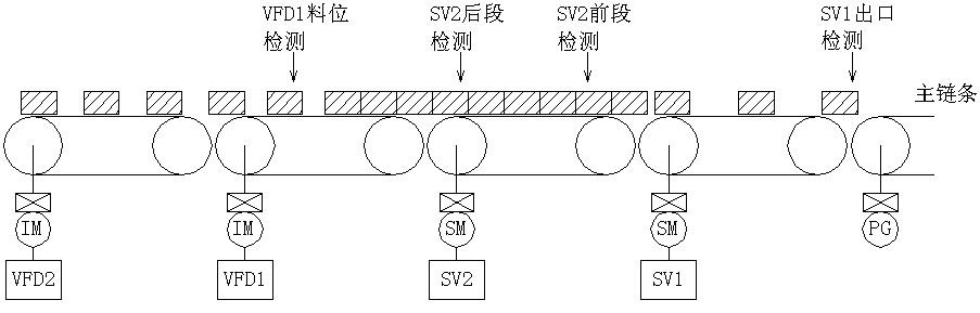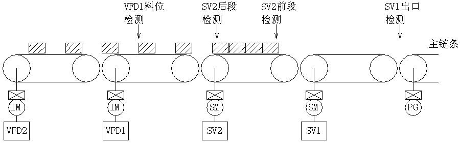 在圖1中,VFD1料位檢測(cè)傳感器沒(méi)有檢測(cè)到物料時(shí),VFD2以稍高于VFD1的速度,二者均高速運(yùn)行。當(dāng)檢測(cè)到物料時(shí),同時(shí)降速運(yùn)行,但VFD2速度仍稍高于VFD1。此時(shí)SV2和SV1以及包裝機(jī)并未運(yùn)行。在圖2中可以看到在SV2后段檢測(cè)傳感器檢測(cè)到物料以后,SV2啟動(dòng)。當(dāng)SV2前段檢測(cè)傳感器檢測(cè)到物料且SV2后段傳感器依然有信號(hào)時(shí),啟動(dòng)包裝機(jī),此時(shí)SV1也啟