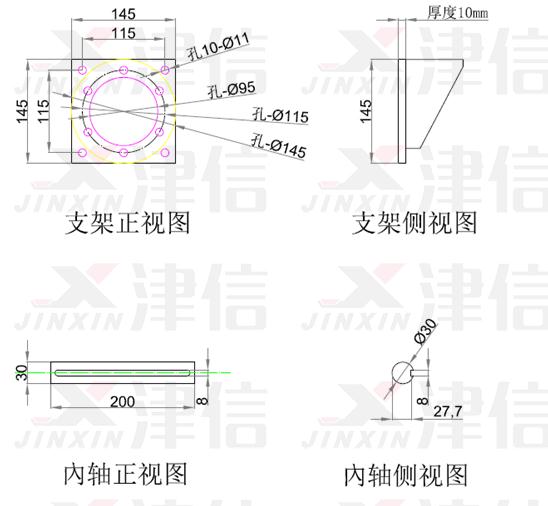 安裝OGD需要按現(xiàn)場條件準備輔助支架和轉(zhuǎn)動軸,這些附件的機械尺寸如下圖: