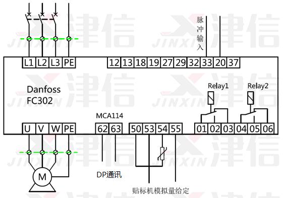 某飲料包裝線的套標機傳輸皮帶使用兩臺同步電機作傳動電機,用一臺Danfoss VLT5000變頻器內(nèi)置Profibus-DP通訊卡,同時驅(qū)動兩臺同步電機。由于電機已經(jīng)使用多年,需要更換。但是原電機采購成本較高,供貨時間也較長,因此上海津信選擇如下解決方案: