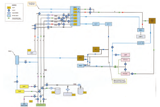 某露天礦場需要考慮三處大型設(shè)施中的水資源集中管理和水資源重復(fù)利用問題,經(jīng)過選型和估算,決定建立一個可處理二百萬立方米的水處理設(shè)施。示意圖如下: