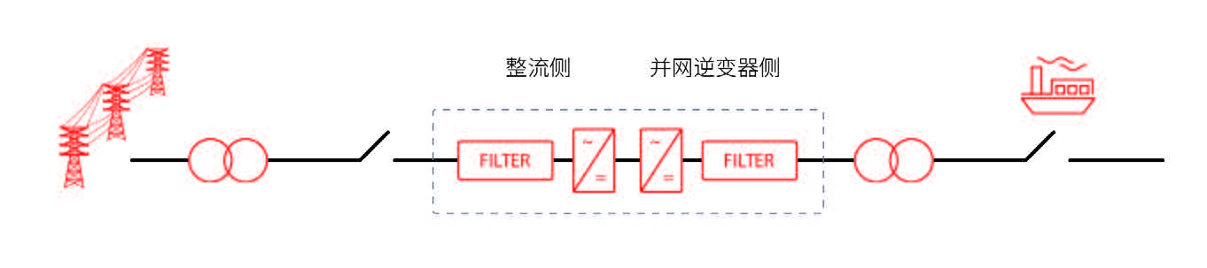 丹佛斯岸電電源系統(tǒng)通常包含岸側(cè)整流裝置和船側(cè)并網(wǎng)變流器裝置,如下圖所示: