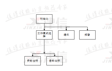 開(kāi)機(jī)后,首先進(jìn)行程序的初始化。初始化完成后同時(shí)調(diào)用工作模式選擇、報(bào)警和PLC與變頻器之間的通訊程序。工作模式中,包含手動(dòng)出標(biāo)、自動(dòng)出標(biāo)兩種狀態(tài)。報(bào)警程序用于對(duì)機(jī)器狀態(tài)進(jìn)行實(shí)時(shí)監(jiān)控,并根據(jù)故障情況執(zhí)行相關(guān)動(dòng)作。