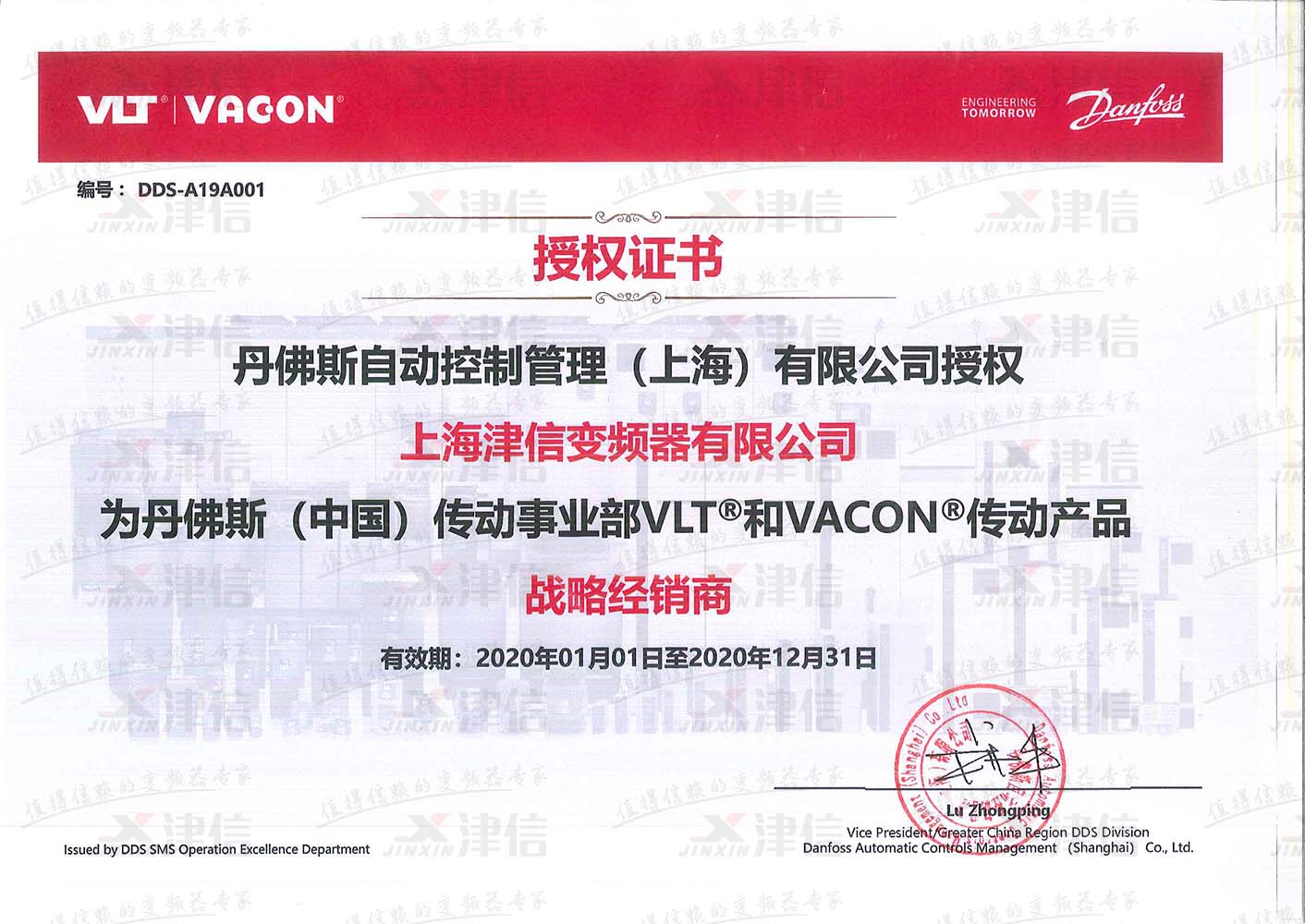 丹佛斯傳動戰(zhàn)略經(jīng)銷商上海津信授權(quán)證書